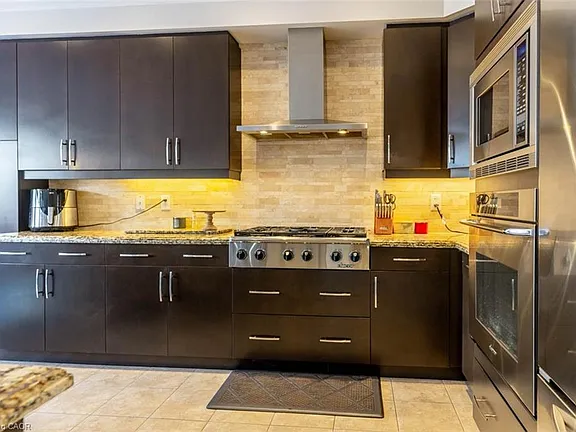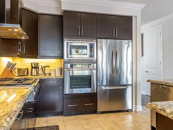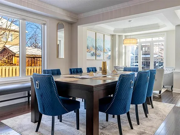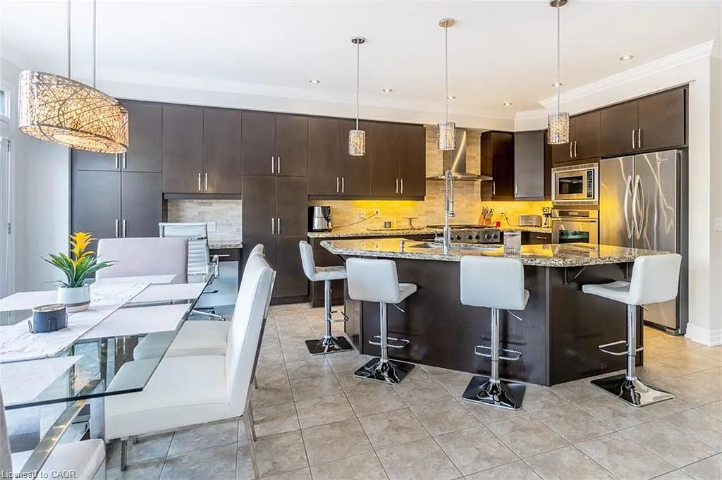 Step into this executive Heathwood home in Milton’s sought-after Scott neighbourhood, offering over 3,200 square feet of thoughtful design, timeless finishes, and family-friendly space. The main floor welcomes you with a sunken foyer, nine-foot ceilings, rich oak flooring, coffered and crown-detailed formal rooms, a private office, and a warm family room centred around a gas fireplace. The kitchen is the heart of the home, featuring granite counters, an island with a breakfast bar, a stone backsplash, built-in pantries, and premium Dacor appliances. Upstairs, four spacious bedrooms each enjoy direct access to a bathroom, including a generous primary retreat with a tray ceiling, gas fireplace, custom walk-in closet, and a relaxing ensuite with two vanities, a jetted tub, and a glass shower. The finished basement expands your living space with a rec room, built-in media wall, bar-height seating, a full bathroom, and plenty of storage, with potential for a future side entrance thanks to the wide side yard. Outside, enjoy a portico entry, stone walkway, a private backyard with a stone patio, and a double-wide driveway with no sidewalk. Located on a quiet street at the base of the escarpment, close to trails, top-rated schools, downtown Milton, and with quick access to the upcoming Tremaine/401 interchange, this is an opportunity to move into a prestigious neighbourhood designed for family living and everyday comfort.